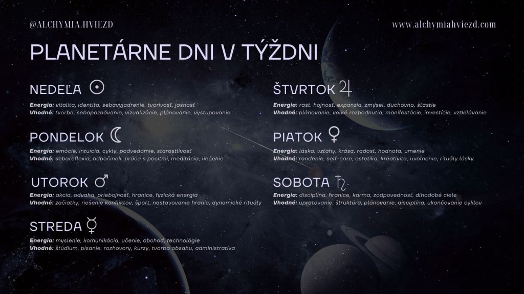 Obrázok: Tu ti ponúkam tradičné rozdelenie – planetárne dni v týždni, ako sa používajú v astrológii, hermetizme aj magickej tradícii. Je to veľmi staré delenie — a krásne funguje aj pri práci s energiami planét v bežnom živote.